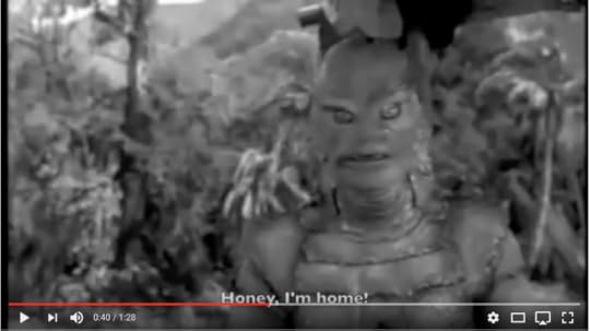 I had another go. This time, I also intercut a couple of scenes from Creature from the Black Lagoon (and I know someone’s going to say something about copyright violations at this point, and my response is (a) I think it’s sort of covered by ‘fair use’ – although I Am Not A Lawyer and (b) I can always take it down if anyone asks my to). I also decided to put it into black and white to match the Creature segments, and I think it works rather well like that. The dialogue is a bit slicker this time, too: