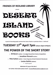On Tuesday April 17th, I’ll be taking part in an event at Redland Library, discussing my favourite short story collections with Ali Bacon, Louise Gethin and Pete Sutton and maybe one or two others.