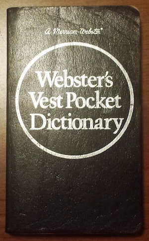 It was back in fifth or sixth grade that someone gifted me Merriam-Webster’s Vest Pocket Dictionary, a blue, smallish reference book of very few words, marginal utility, and if memory serves, much excitement. It was such a desirable book that, even though my mother purged it from my shelves in the Great Garage Sale of 1980, I was able to pick up a replacement used copy about a decade ago.