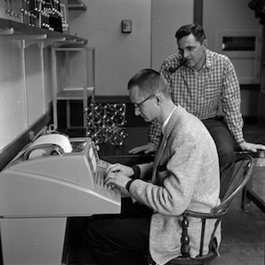 [Image Credits: Geology professor Robert Reynolds, at right, and chemistry professor Roger Soderberg develop a computing component for their course work. (Photo by Adrian N. Bouchard/courtesy of Rauner Special Collections Library, Dartmouth College)]