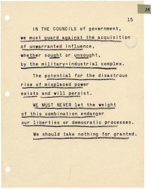 Image Credits: Farewell address by President Dwight D. Eisenhower, January 17, 1961; Final TV Talk 1/17/61 (Page 15), Box 38, Speech Series, Papers of Dwight D. Eisenhower as President, 1953-61, Eisenhower Library; National Archives and Records Administration.