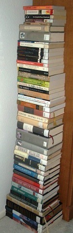 The image to the right shows the books (or all but four of them that hadn't arrived from the library yet) in all their four-foot-high glory. When I see a screenshot of the book covers on my iPad, it doesn't seem that intimidating. But having seen them in person, I can now say that four feet of tree pulp is very intimidating.