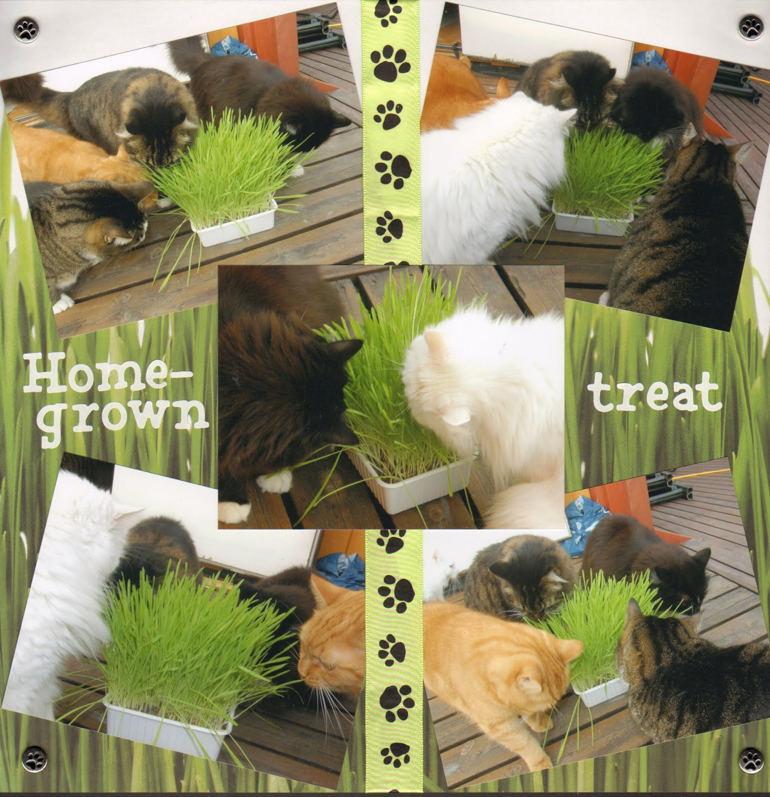 A home grown treat in a box! Probably not as tasty as regular outside grown grass though. And the mess... I don't think I'll ever give them this inside again, it is incredible how much mess a cat or two can make with a box like this in a single night!