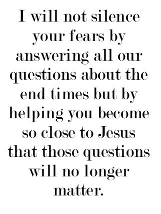 Sharon, I will not silence your fears by answering all our questions about the end times but by helping you become so close to Jesus that those questions will no longer matter. Jesus didn’t tell us these things to scare us, but to let his love prepare us for the day of his redemption. That’s as critical for what you face in your life today as it will be at the end of the age. Any fear causes us to slip into self-protection mode, which makes it difficult to recognize how he is at work around us. This is where we make our worst decisions, often with our best intentions.