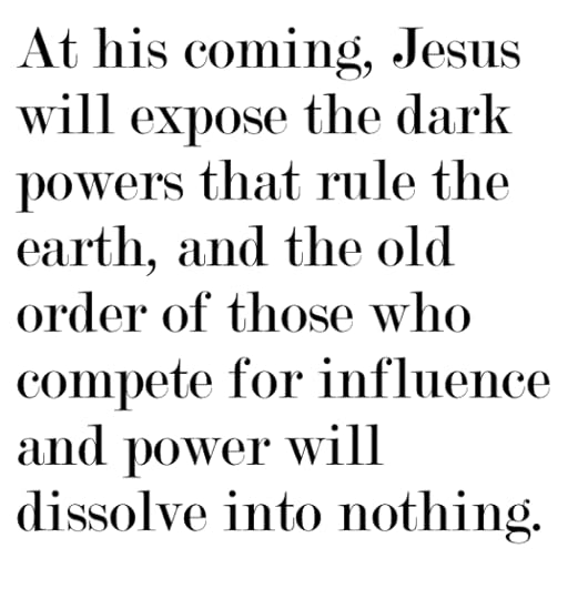 At his coming, Jesus will expose the dark powers that rule the earth, and the old order of those who compete for influence and power will dissolve into nothing. Kings, presidents, prime ministers, dictators, and CEOs will all lose their power, national identities will be obliterated, and suffering will cease at last. Though I have lost sight of it at times, I’ve never doubted that he will yet come.