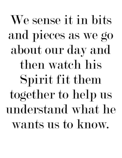 Resist the urge to read into things on your own, as if everything is a piece of that puzzle. Doing so, you’ll contrive your own insights again. Let the Spirit highlight what is from him. Look less to get specific questions answered as seeing what he is revealing. The first puts our focus on him, the latter puts it on us. What the Spirit reveals may have nothing to do with what we are asking of him. He is simply showing you the way things truly are, so you’ll know how to live. He will give you a different way to think about him or something you’re facing.