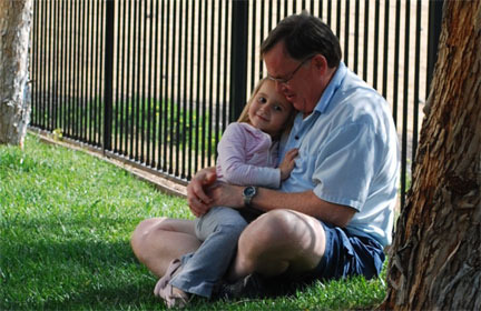 A big part of God's instruction to me in this arena has been in my emotions and love for my own children, and now for my growing brood of grandchildren. i can't believe how much I loved them, right from birth. I love the relationship I have with each of them and how much they enjoy being with their grandpa. I know the tenderness I want them to feel in me, and the fierceness that would protect them at all costs. A year or so ago, my daughter took the above picture of me when I was so deep in a conversation with Aimee that I wasn't even aware that her mom was taking pictures. When I saw it the first time, my heart leapt. It has become the picture that illustrates "Abba" for me–a child quietly at rest in the arms of someone she completely trusts.