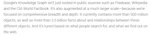 In 2012 google got a bit smarter, as it does with each of its search algorithm updates and introduced knowledge graphs. What a knowledge panel or knowledge graph does is put the concept of open data over the web to provide rich, informative and relevant search result pages. It is focused on answering all questions that follow up after a search on a pretext has been made in a SERP(Search Engine Result Page) making google search receptive and friendly for users.