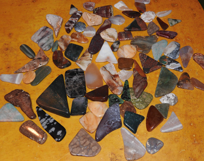 I'm also collecting a rather large number of earth-tone stone tiles. At one point, we made a stone mosaic birdbath, and the birds just love it. Indeed, the Cardinals use it every day, perhaps because we used a lot of red jasper and bloodstone in the mix, and they feel like the red color is calling to them. This birdbath has stood up well to the weather over the years so I don't need a new one yet.