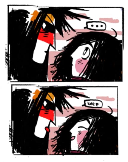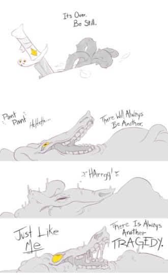 In the first comic, which is from the Warrior’s point of view, the Warrior has defeated the Monster, who jeers that there will always be another Monster to fight. The Monster dissolves into mist, leaving another tiny, baby Monster in its place. The Warrior picks up this helpless new baby Monster and carries it away. They will try again and do better this time.