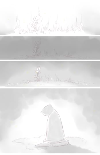 In the second comic, which is from the Monster’s point of view, the Monster says that this has to happen; it can’t come with the Warrior, and there will always be another. It tells the Warrior to use what they have learned to fight. It wants to die knowing that the Warrior has hope for the future. It dissolves into mist, and the exhausted Warrior collapses. The new baby Monster comes and brings the Warrior some water in a leaf. Because we are reading this in the Monster’s voice, we realize that it is a new Monster, but also somehow, magically, the same. We also see that the Monster is not inherently evil. It is only very strong, and inevitable.