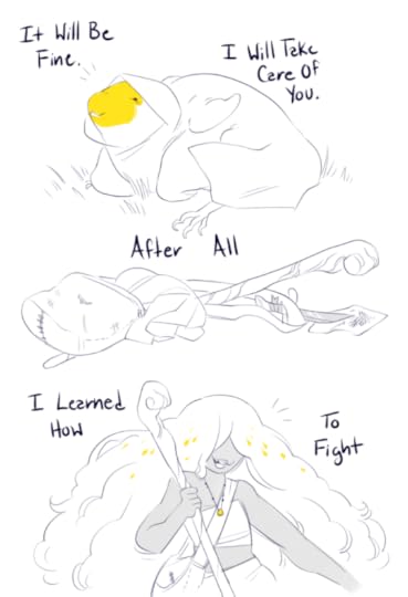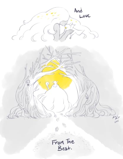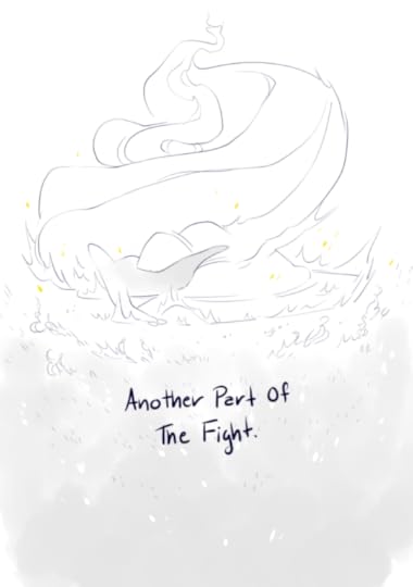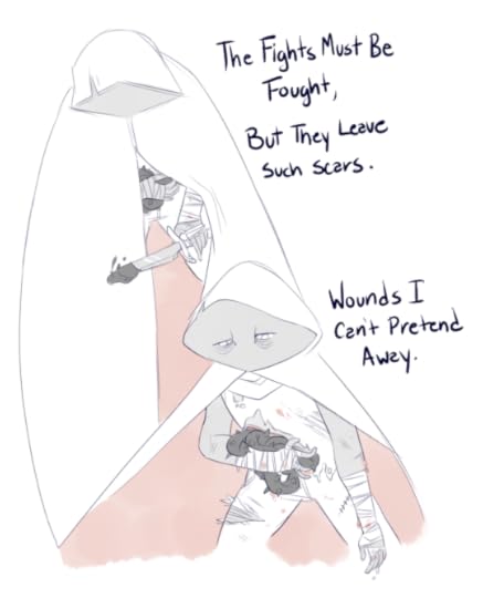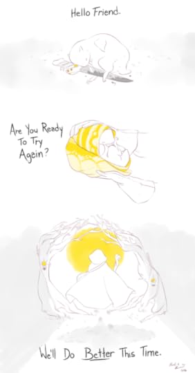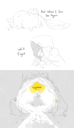 The third comic is a dialogue between the Monster and the Warrior. The Warrior is exhausted and horrifically wounded. The Monster is also horribly maimed. They are both dying. The Warrior doesn’t want to fight anymore. The Monster tells them to rest and heal. The Warrior hands over their amulet, and we see the Monster’s paw become a hand just before they both dissolve into mist. It clears, revealing that the Monster has turned into a beautiful humanoid, who says they will take care of the new baby monster the Warrior has turned into. The two have changed roles. The Warrior takes up the former Warrior’s gear and strides into the new year with the new baby Monster riding on their shoulders.