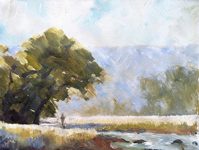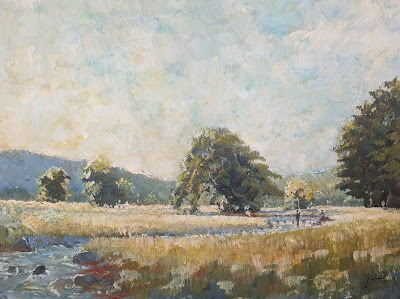 So I went back to my second version, the river scene, and painted over it yet again, restoring it to something like, but hopefully better, than the original. I decided to keep the original painting just a landscape, so I added the figures fishing from the original (digital) version in "post" i.e. I cut them out of the digital version of the original painting and patched them into the new digital version.