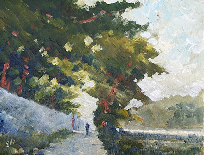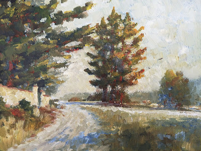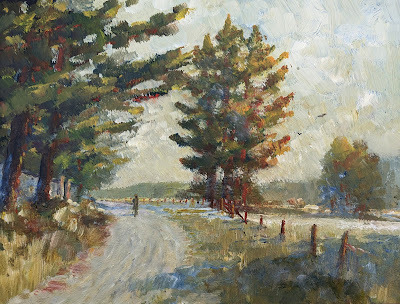 And just to put everything right, I repainted the road scene painting again to eliminate those clunky figures. I did, however, keep the fence line and the wall further back in the woods.