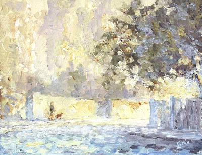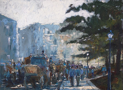 Since the Chateau Clare, the estate that Lan Taya inherits is central to the story, I had initially considered painting a view of it as the cover art. However, I know that painting buildings in any detail is not my strong point as a painter. I'm more comfortable more organic forms and the "impression" of buildings. In addition, as a practical consideration, given the portrait shape of the cover, if I wanted to fit the whole chateau in on the front cover, it would've had to have been very small, with a lot of sky. Instead, I chose the more intimate scene, above, for the cover. It has Lan meeting Cia at Mayfair Square on a summer's morning. It is the type of scene I am more comfortable painting. My inspiration for the cover was the painting below, one of my earlier paintings. I didn't quite get the richness of the sunlight that was present in Crescent Morning, but I ain't the painter I used to be.