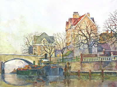 For the next decade I painted maybe 50 watercolor paintings a year, following the seasons on watercolor paper, though the first dozen or so paintings I did in colored ink. Beginning around the early 2000s, I started using thin acrylic paint on what was marketed as watercolor canvas. I felt that watercolors on this canvas were too dull, and by using acrylic paint, I could, not only produce a brighter painting, but I could go back after the paint dried and apply washes to enhance the mood without "lifting" the paint, unlike with watercolors.