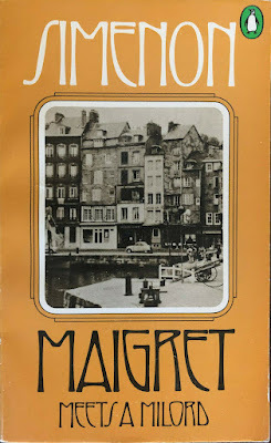 The Belgium born writer, Georges Simenon wrote around 500 novels and many other books and stories in his long writing career. From his introduction in 1931, the Paris police Chief-Inspector Jules Maigret appeared in 75 novels and 28 short stories. Maigret Meets a Milord is his second novel, written in 1931 and translated into English in 1935. The edition I have, pictured above, is one I've had around for 50-some years. It is old and glue holding the pages had dried and cracked so that the pages were falling out of it as I read it.