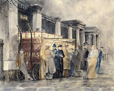 A small point; in one of the episodes, Jenkins, after attending a ball, runs into an artist friend and his girl helper late at night, and he is invited to join them to get a cup of coffee at "the stall by Hyde Park Corner," where they meet another friend of Jenkins. Many years ago I painted that very stall by Hyde Park Corner, base on a photo in the book, The Spirit of London by Paul Cohen-Portheim (photo #101 2 A.M. At Hyde Park Corner.) I have reproduced my ink painting below.
