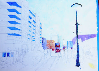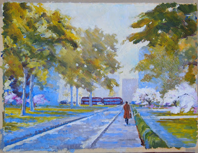 In this first attempt, above, I've brightened the painting, toned down the blues and upped the yellows to create a bright spring morning look. I faded the colors of the tram and distant buildings in the distance to create a greater sense of distance. And finally, I added the cartoon effect to sharpen everything up a bit.