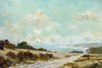 While this seemed doable, I feared that the car might give me trouble, given my impressionist style of painting. As I said in the post about the first cover, if you paint in an impressionist style, you want to make sure that viewers know that your lack of attention to details is deliberate, not a result of incompetence, so painting something that looked like a car in the free, impressionist style would be a challenge. I was also having trouble designing the painting that would wrap around the print version. I needed the action - the car - on the front cover so the road would have to go to the left, as in the painting above, but where to put the car and how big in needed to be without it being lost... I hesitated.