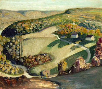 Then one Saturday I happened upon the paintings of Grant Wood, and more specifically, his birds-eye view of Iowa. Below is one such painting, or rather it seems to be an oil sketch for a painting that I've yet to find the finished version of. I'm using it here because I think it the best of the series of such paintings, I've never found a finished painting that is, in my opinion, as good as the sketch. I like the freedom of sketches over the more rigorous painting of the final version. Anyway, the sketch: