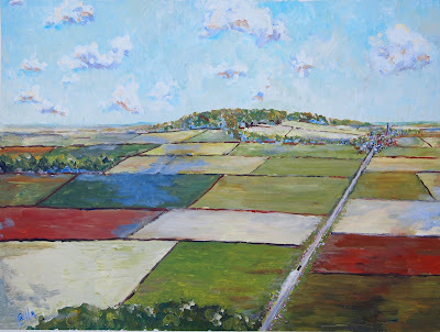 Seeing those paintings got me to thinking. Could I take the same approach? Could I use a birds-eye view of flat farm fields stretching into the great distance of the steppes, conveying the vastness of a major setting in the book. It seemed doable, from my talent point of view, and in keeping with my general policy of going for mood over specific scenes. So I painted the picture below.