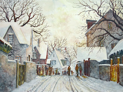 Below is a scene from the winter holidays in the imaginary country I rambled about in for several decades painting.