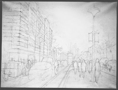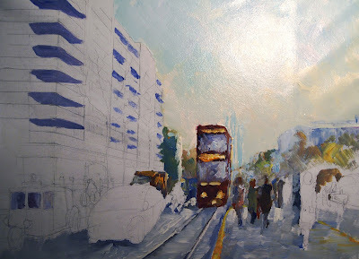 At this point I realized that I was in trouble. This piece was falling into the uncanny valley of where it looked like I was trying to paint realistically, and failing badly. This is always the great danger of impressionism. You have to make certain that your viewers realize that you’re trying to paint without regard for realism. It’s loose and sloppy on purpose. The problem for me is always the middle distance. I try to paint scenes that include only the foreground and a background, That middle distance, where things get gradually smaller and less detailed is something I am terrible at. And here we had that middle distance in the receding buildings and tram. To eliminate as much of that as possible, I planned to bring the tram into the foreground. You can see the pencil sketch over the smaller version. And I hoped that the bare trees would cover up most the middle buildings.