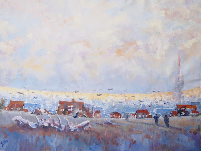 After sketching it, it took me several weeks to get around to actually painting. And then, I just did the sky with the three remaining towers of London’s Solar Age in the distance. A week or so later I worked in some details in the middle ground to arrive at the painting below.