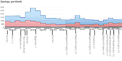 In that post I included the graph below that showed his Amazon ebook and paper back book income form 2019-2020. The red is income from his ebook sales, the blue from Kindle Unlimited page reads, and the sliver of grey being paperback sales. It does not include his income from audiobook sales.
