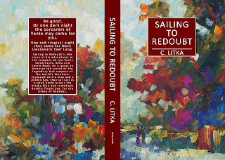 This is a brand new cover for Sailing to Redoubt. This is a scene that I painted on the imaginary island of Lil Lon, which is a locale in the story, so that unlike the last version, there is a direct connection between the cover and the story -- though I chose to go with this piece because I wanted lots of color. I flipped the picture so as to use the it to wrap around the cover as a single painting.
