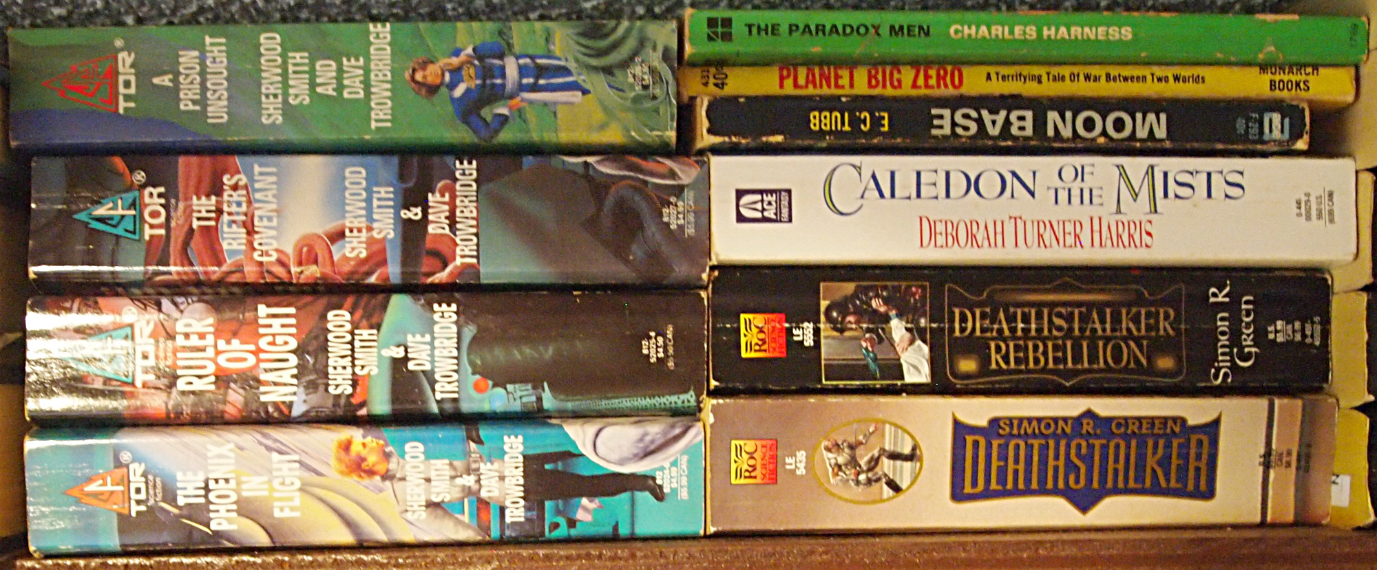And finally, the last of my 90's books, what books I have of the Exordium series, and two books of the Deathstalker series. I was finding SF books in general to dark and grim for my taste in this period, so that my interest in SF waned and I stopped dropping by the local bookstore. I also realized that I had way too many books, and that one day I, or my heirs, would have to either move or dispose of, so that I only have acquired a couple dozen books in the last 20 years, and instead relied on the library for my reading pleasure. And I did have to move them, and it was heavy work, indeed.