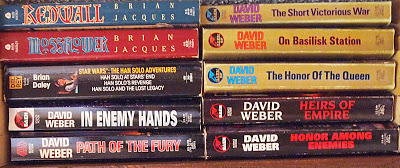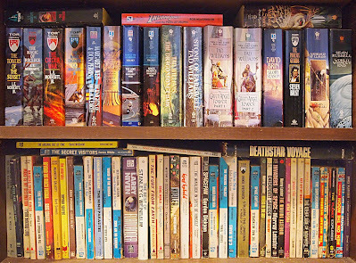 Here we begin to see some of the SF books I picked up likely in the 1990's. I have 8 Honor Harrington books. I stopped reading those after I found myself rooting for the "socialist" Peeps and realized that they would never win.