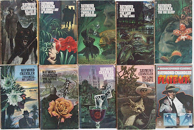 As I promised in a recent post, a chance discovery of a new writer (for me) in a new genre, sometime just after my college years, changed the way I enjoyed reading. The genre was private eye fiction, and the writer was Raymond Chandler. I have no recollection of how I came to read Chandler. Perhaps it was that Humphrey Bogart played the detective hero Philip Marlowe in an adoption of his novel The Big Sleep. I was a big Humphrey Bogart fan. Or it may’ve been the Ballentine Book covers of the early 1970’s edition that enticed me to pick one up off the book rack and give it a try. In any event, I picked one up and read it – and proceeded to search out the nine, and eventually ten Chandler books Ballentine published around that time.