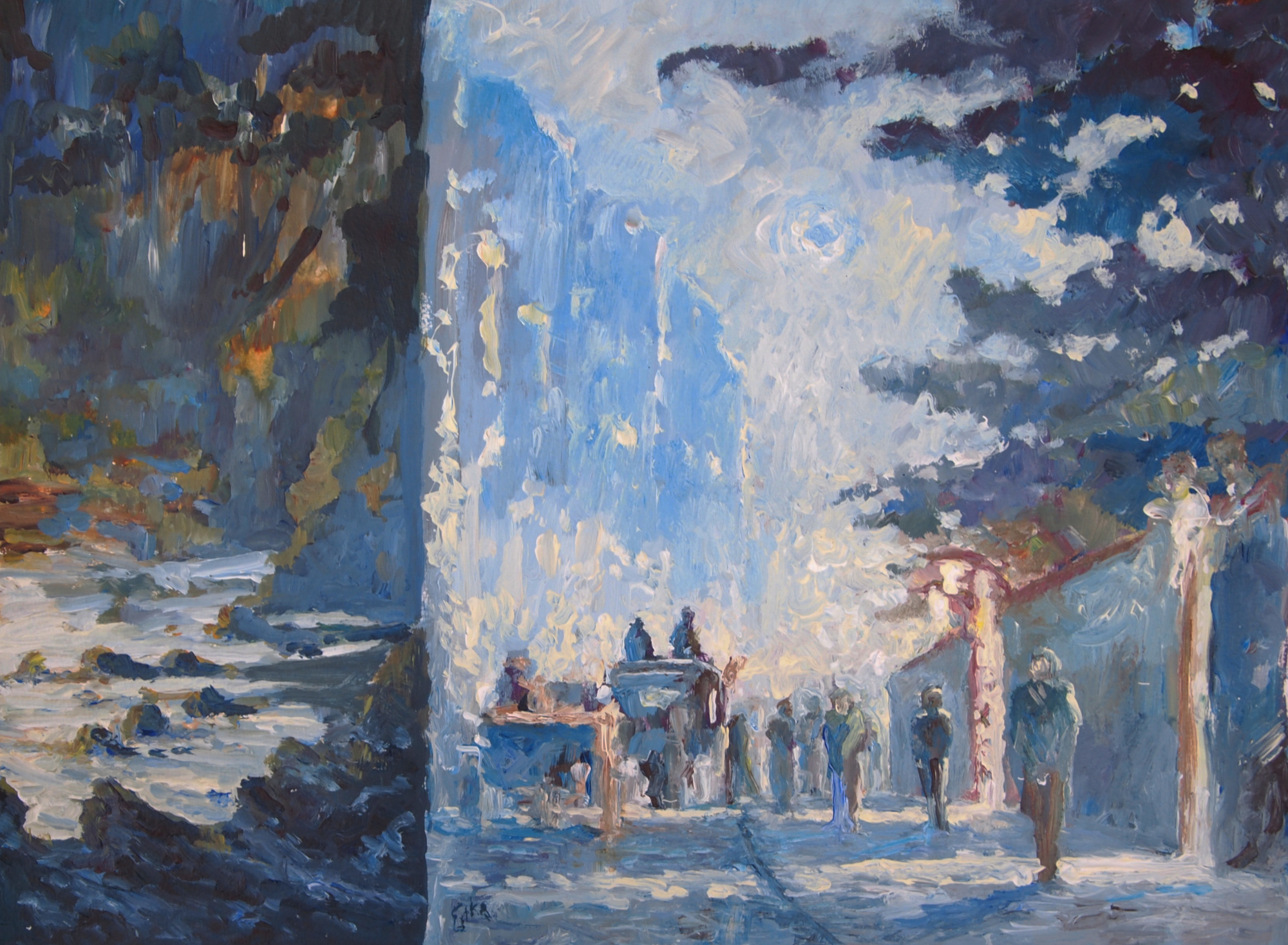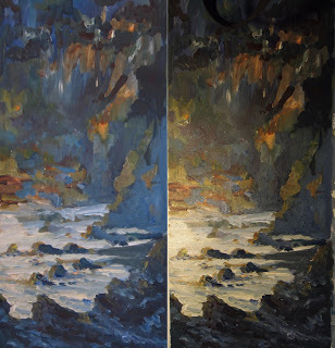 For this new story I faced a real problem. All the characteristic scenes that I could draw upon for inspiration take place at "night", and mostly in an old forest, giving this old landscape painter very few options. Plus, given the story’s narrow focus, I’d probably need to include people in the painting as well. Which I’m terrible at.