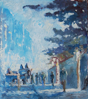For almost all of my covers, I enhance my artwork on the computer using Gimp, a free Photoshop alternative, adjusting the colors, and adding the black outlines that sharpen up my rather sketch paintings. For many years before I started publishing my stories painting was the focus of my creative drive – mostly impressionist landscape paintings in the last 17 years, and before that watercolors in a rather folksy style. I have, however, run out of steam when it comes to painting, so that painting covers for my books is work – work I’d like done as fast as possible. Plus, I’m not an illustrator, nor someone who cares, or has the talent for, paying attention to details. Which is to say, I'm not a good cover artist. But I'm cheap. So I settle for impressionistic covers that I hope imparts a sense of mood of the story it is illustrating.