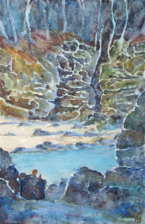 The scene I chose takes place in a cliff lined hollow, in darkness. However, at some point there is light flooding from a large cave, that I could use to banish the blackness. As you can see, it pretty much sucked. For my second attempt of the same scene, I tried a different painting technique, a watercolor approach. Below is this second effort. It sucked as well.