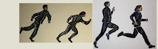 But, I need some people in it. They could be small, but I needed some sort of action. So I got out my “How to Draw Comics the Marvel Way” book and sketched out a couple of figures. Even with the book, they were bad. Note the theme running through this post. I tried them out -- the ones on the left-- and then decided just to find some clip art runners and trace over them for my figures. Those are the figures on the right.