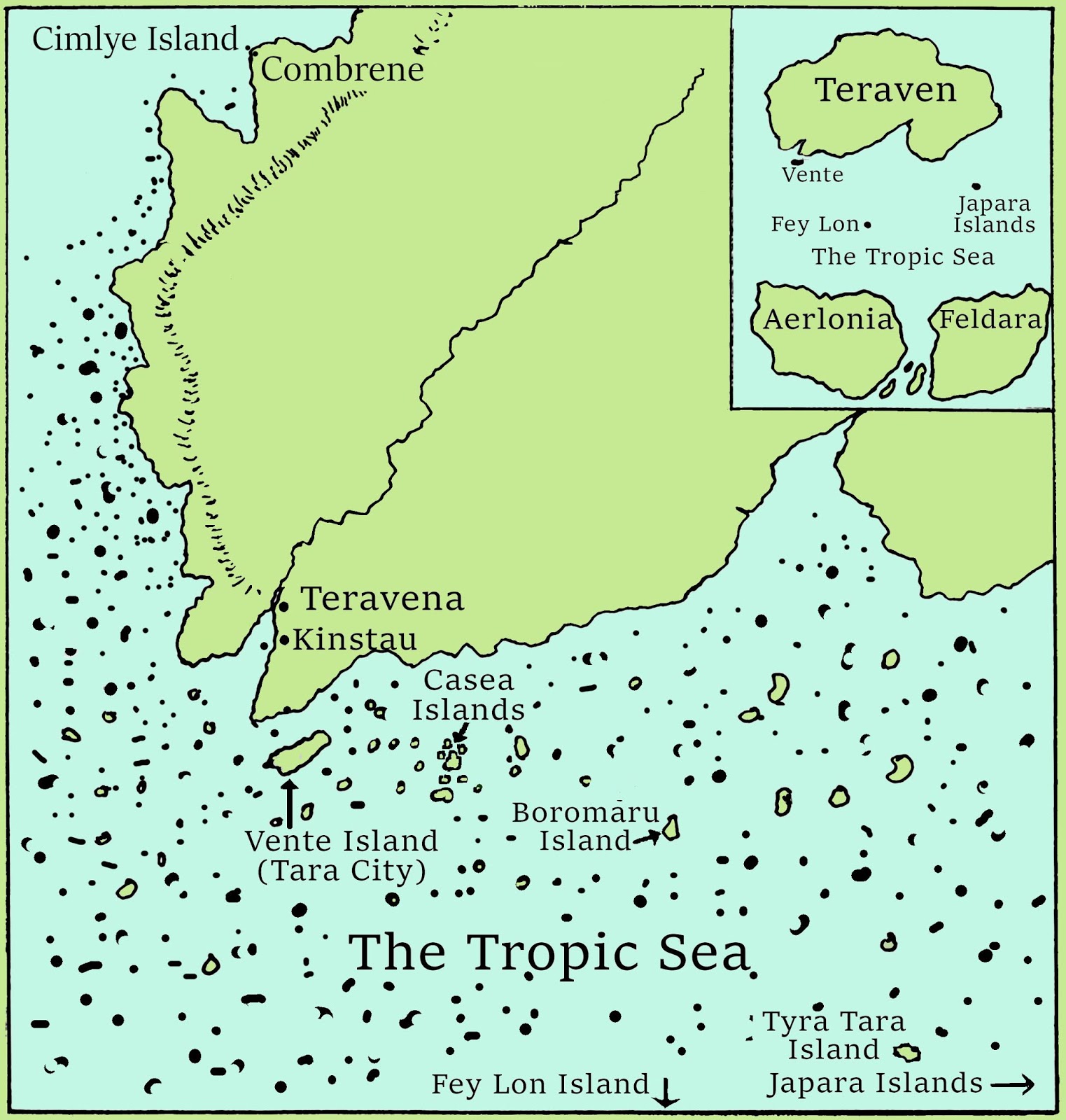 Below is the rather simple map necessary for The Prisoner of Cimlye. It is just a detail from the larger maps of the Tropic Sea found in Sailing to Redoubt and here on my blog: