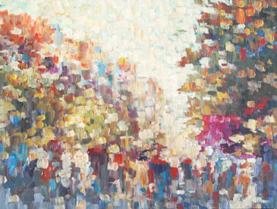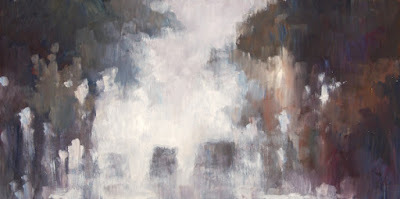 This week I tried something different. Imagining a scene and painting it with nothing specific in it, just implying the scene. My first effort was a rainy evening street scene of sorts "Rain"