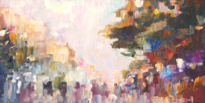 I liked how it came out, and well, the bulk of it took about the length of three or four Angus and Julia Stone songs to paint -- within my attention span. I then got the idea that I might try the same technique using a lot more colors and to kill two birds with one stone, try a scene from Beneath the Lanterns, in this case the Reed Bank -- a street in the story lined by townhouses on one side and eating houses, tea houses and drinking houses lining the shore of a lake on the other. So today I did "The Reed Bank", a detail of which I used for the new cover. I pictured the Reed Bank on the last day of the Bright Days, with the Yellow Lantern setting behind us and the street filled with carriages and rickshaws -- but of course, the idea is not to actually paint them, just imply them. (Or anything else you might imagine.)