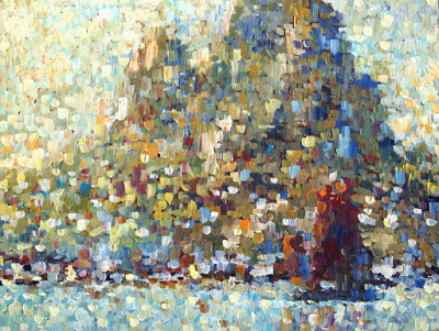 I've been painting regularly for 35 years now. In the beginning I painted with watercolors with a fair amount of detail. I mostly painted imaginary scenes. By the time I switched to a thicker paint; oils and then acrylics, I lacked the patience to learn how to use them to paint with any details. Instead I opted to paint in the impressionist style, a style, however, that I really like. Fast forward 16 years, and these days I have an even shorter attention span, and have run out of new imaginary places to paint, so it has been hard to paint.