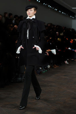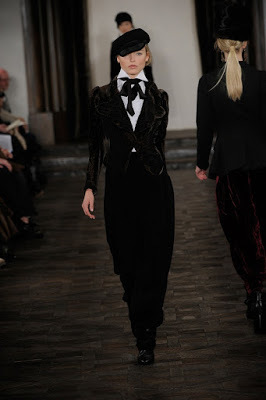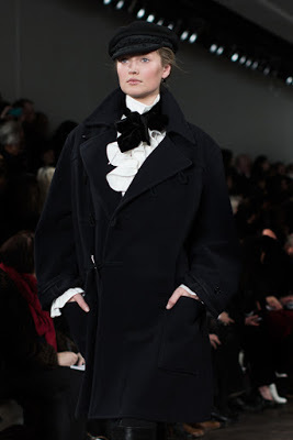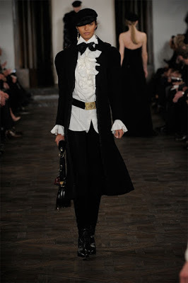 That said, I did have a sense of how Tallith Min dressed. The pictures below, from a Ralph Lauren fashion show, give that sense of how she dressed, though the details differ. I envisioned a bit more Napoleonic military uniform style -- more buttons and jackets rather than big coats. Still, these photos informed my sense of the character.