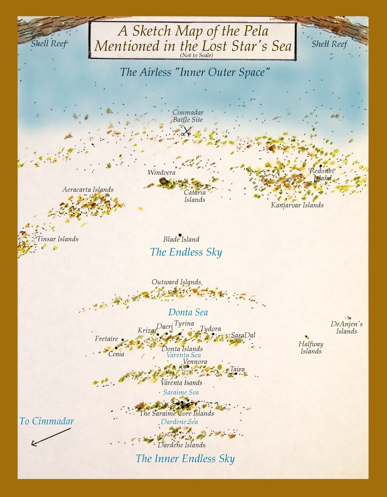 In order to help readers envision Wil Litang's travels throughout this little section of the Archipelago, I worked up this sketch map of the story's Pela. It is not drawn to scale; it merely shows the relative positions of the major islands Wil discovers in this travels.