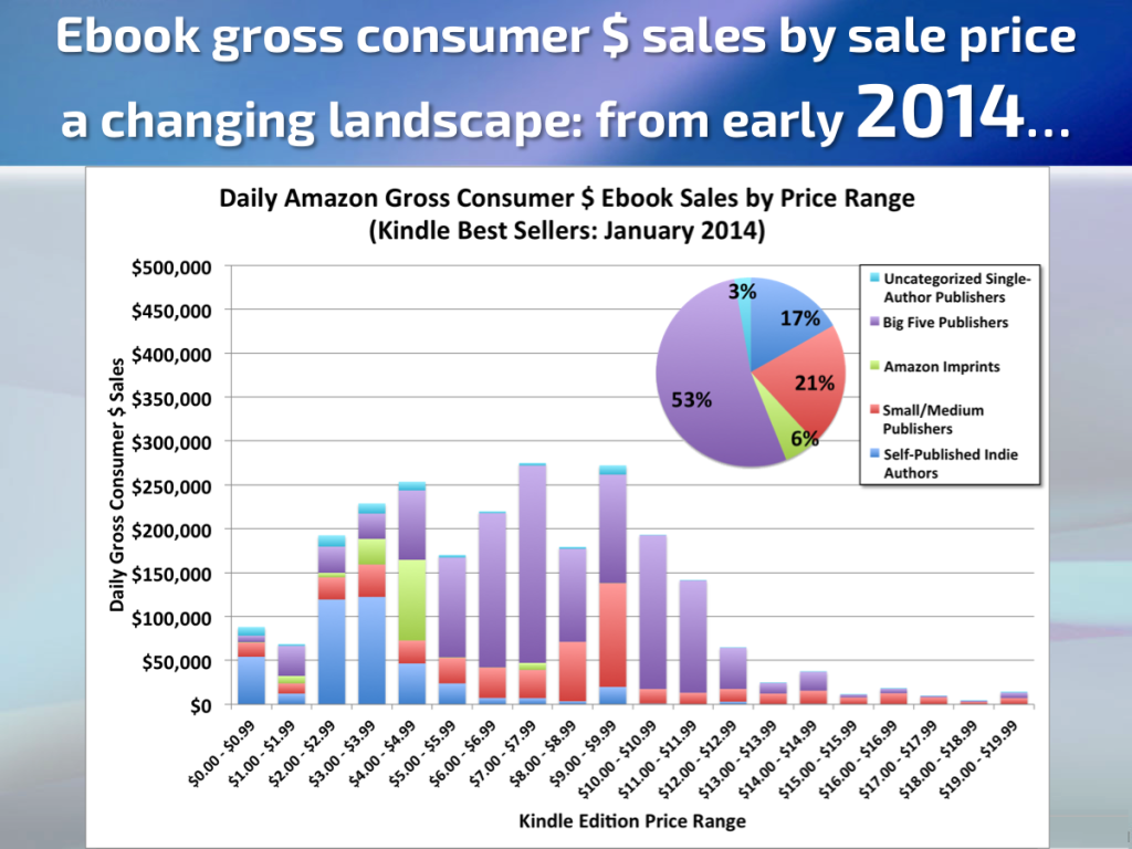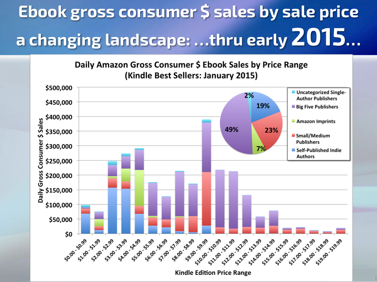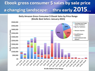 Still, this has been the case for several years now, and prices have not collapsed. But the number of $.99 ebooks has been slowly growing. I was just finishing up my final draft of this post when Author Earnings released their October 2016 report.( http://authorearnings.com/report/october-2016/ ) In it they report a significant drop in indie publishing earnings. The report also provided some additional charts so that we can trace the rise of the $.99 ebook right up to the present using charts from Author Earnings' presentation at the Digital Book World conference. ( http://authorearnings.com/2016-digital-book-world-presentation/ )