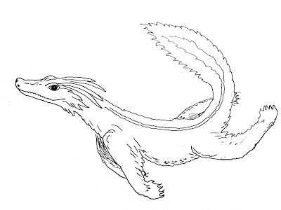 The actual sentry-serpent, or Simla dragon as it is know in the part of the Pela that the Castaways of the Lost Star takes place in, is a serpent dragon which looks much like a rather slim, feathered crocodile. (See the quick sketch above.) Simla dragons move in weightless conditions much like earth crocodiles swim through water, using their tail, with it's feathers extended to create a broad paddle, and with a little help from their legs.