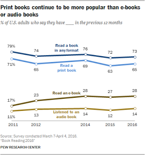 Will the demand side ride to indie publishing's rescue? Ebooks, after all, are touted to be the future of books. Not likely. The 2016 Pew Research Survey ( http://www.pewinternet.org/2016/09/01/book-reading-2016/) chart below, shows that ebook readership rose from from 17% in 2011 to 28% in 2014 and has since plateaued.