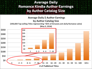 This chart shows that a romance author can expect to make $2 a day, or $730 a year with one ebook on the market – though for how long that revenue lasts is not stated. Once an author has written 20 to 30 books – perhaps 10, or 20 years down the road, an author might be earning about $30,000 a year. And these figures are based on past sales levels, when most books were sold for more than $.99. An indie author/publisher selling books at $.99 each, would have to sell 28,571 copies to earn $10K, 71,428 copies for $25K and 142,857 copies to earn $50K in royalties – though most ebooks sell in the 100's of copies. And for an indie publisher to make a commercial business out of it, they would need to sell that many ebooks – year after year for a decade or more for a “career” as a “professional” indie author/publisher.