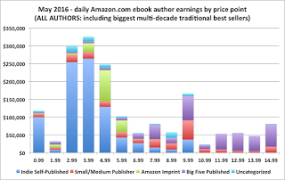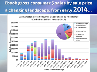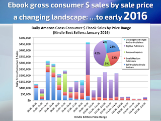 As I mentioned, the indie publishing market has been growing, and gaining market share from traditional publishers – so the future looked rosy for the successful indie publishers as a group, giving them no incentive to cut prices. That may have been changing over the last several months. The Author Earning's October 2016 Survey( http://authorearnings.com/report/october-2016/) shows that indie publishing took a fairly steep nosedive in sales – giving up a year's worth of growth. There are a number of theories why this happened, but the most likely seem to revolve around traditional publishers putting more effort into to advertising and special price deals – both on Amazon and on BookBub, a popular newsletter for readers that offers special deals and is a driving force for sales.It seems that it has become increasingly hard for indie publishers to get their books selected for inclusion in BookBub, and paid advertising is too expensive for most indie publishers. In addition, Amazon may be tilting its pricing practices in a way that favors bigger publishers. This is only a single quarter survey, so nothing can be said for certain about the future, but from what indie publishers are saying, the industry might be facing more headwinds from some deep pocket competitors than it had before. We will see how it responds.
