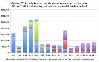 The first three charts show sales by price point from Jan 2014 to Jan. 2016. In Jan 2014 the $.99 category comprised about 35% ebooks sold in the indie market; it rose to 36% in Jan 2015, and to 38% in Jan 2016. The bottom two charts show earnings for May 2016 and October 2016. Since they report earnings rather than sales, we need to take an extra step and compute sales from the earnings' figures. Once that's done we find that in May 2016 the $.99 category had risen to about 48% and in October, to about 64% of the indie ebooks, about 3 million more $.99 ebooks a month than in May, resulting in a significant fall in indie author earnings. This suggests that the indie market is well on its way to the universal $.99 ebook price. Still, one quarter does not prove anything, so we'll have to wait and see how things shake out going forward.
